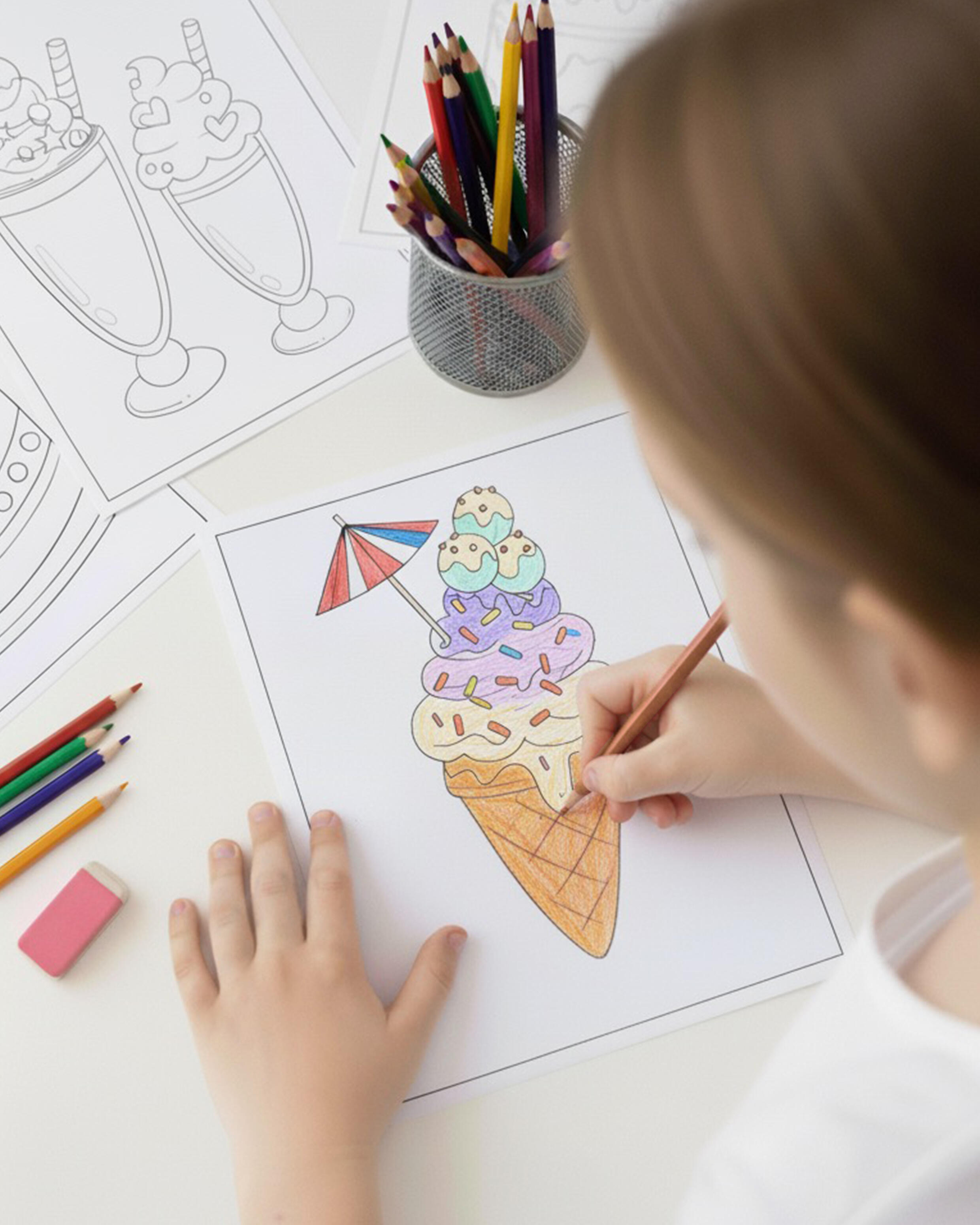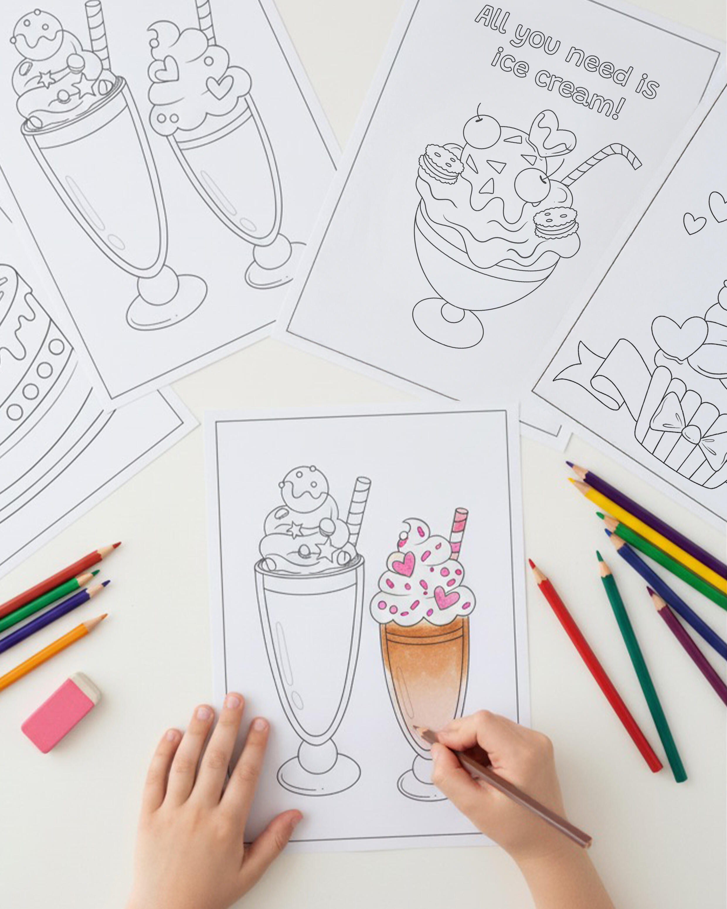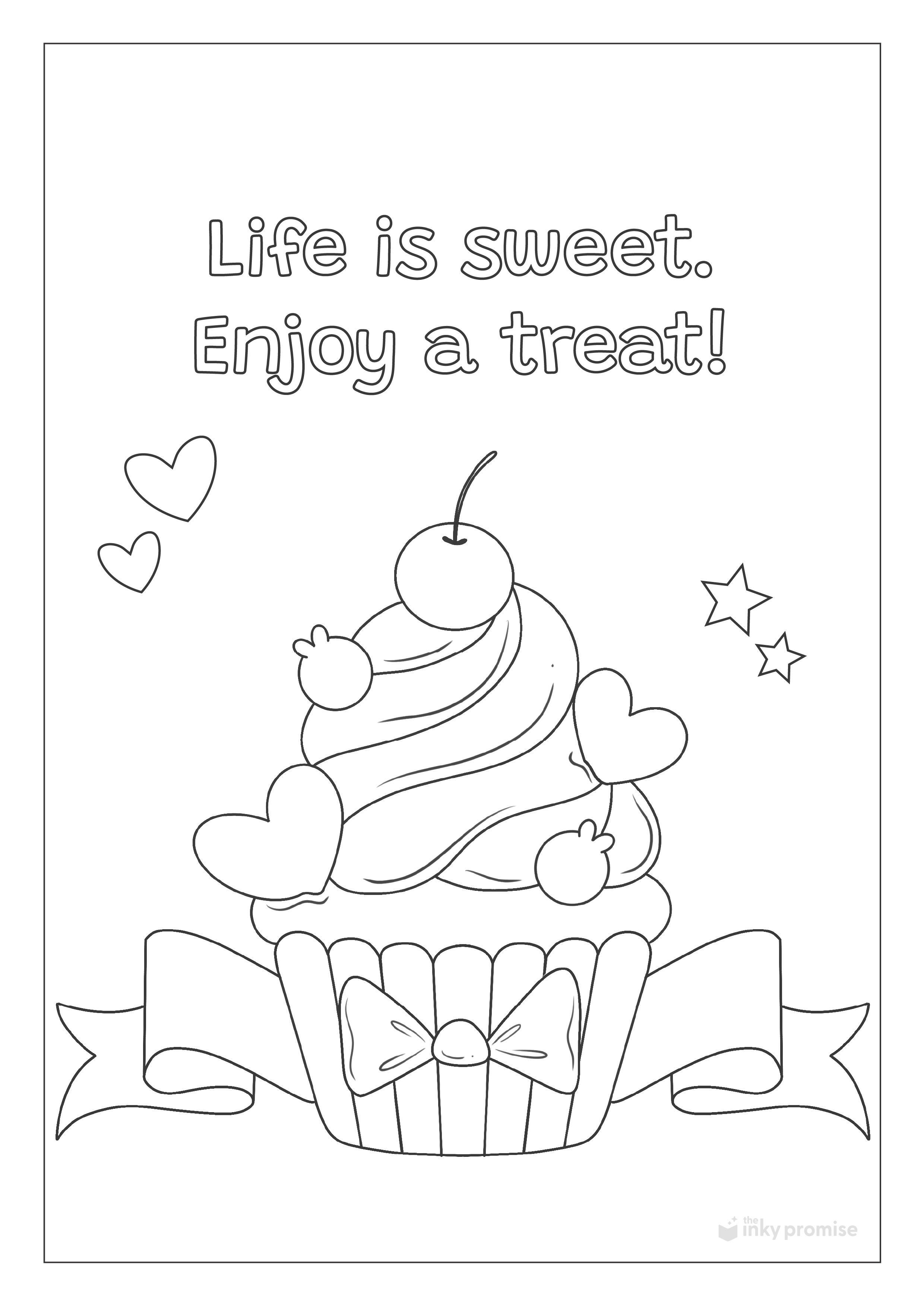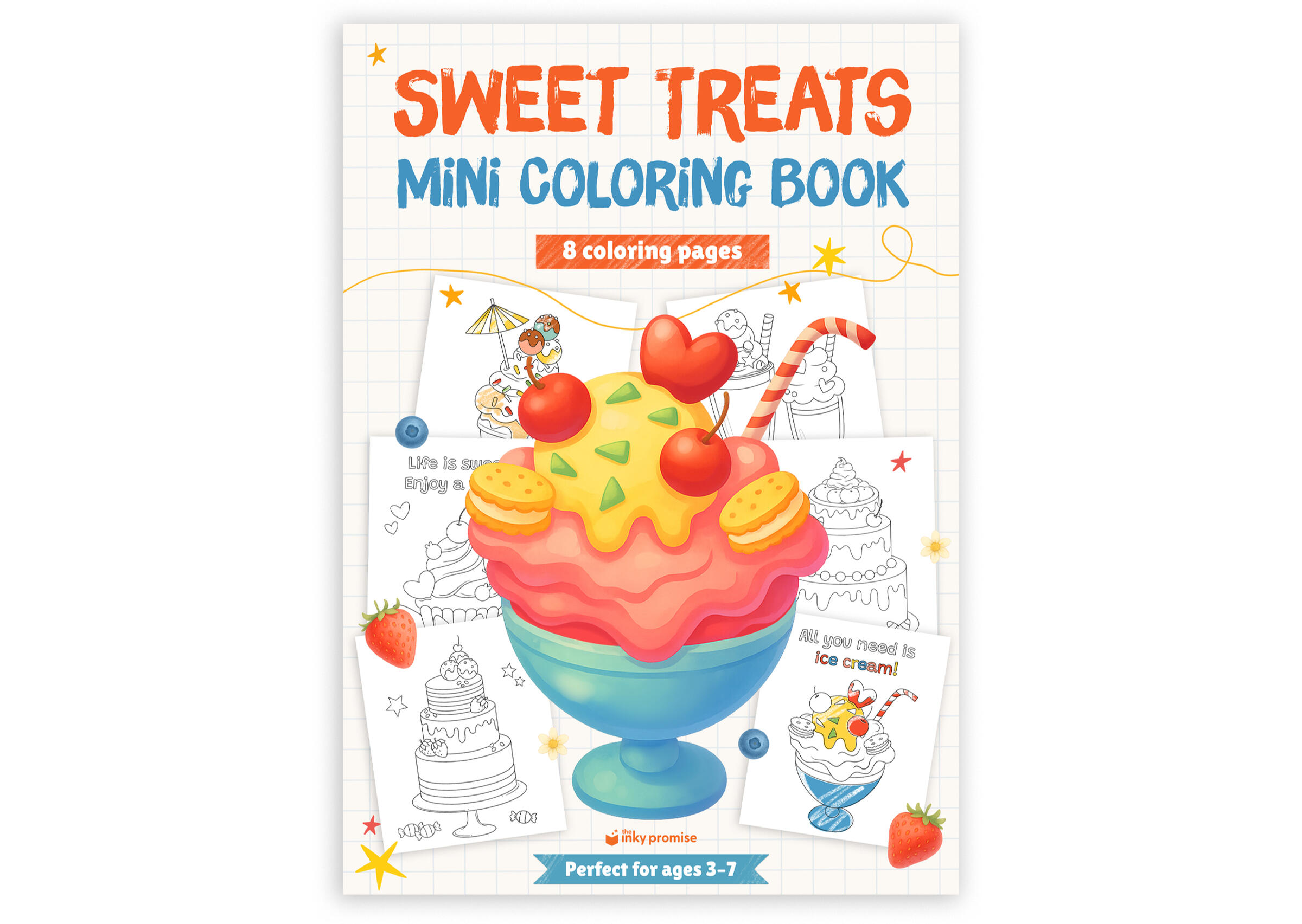 Download and print a coloring book "Sweet Treats".- Includes 8 printable pages with desserts, ice cream, and cakes.